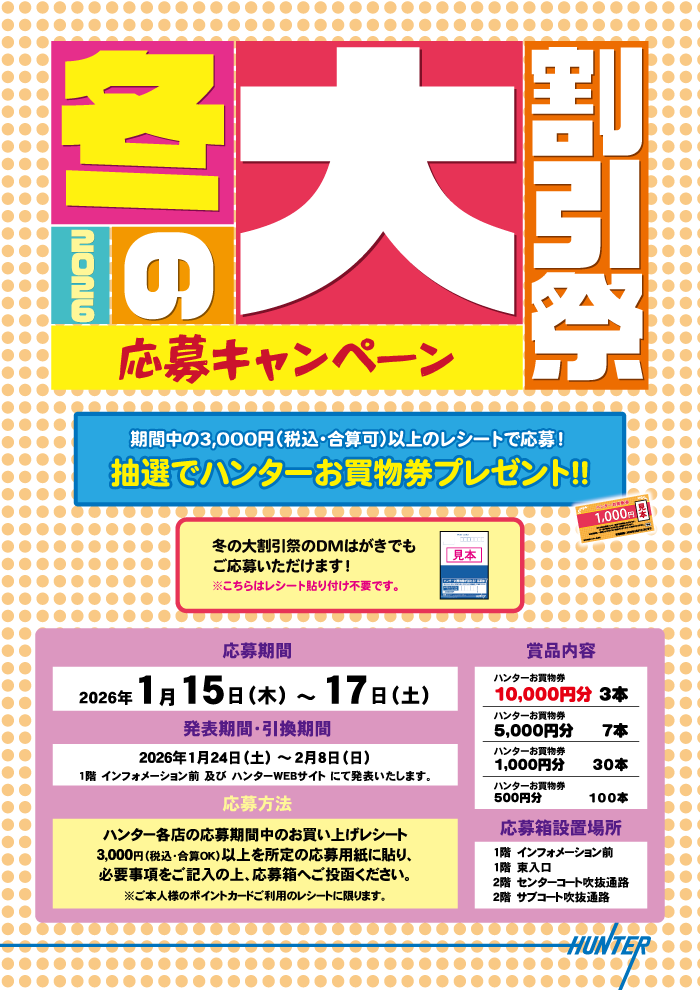 ハンター各店の期間内お買い上げレシート3,000円(税込・合算可)以上を応募用紙裏面に貼り付け、必要事項をご記入の上、店内設置の応募箱へご投函ください。
